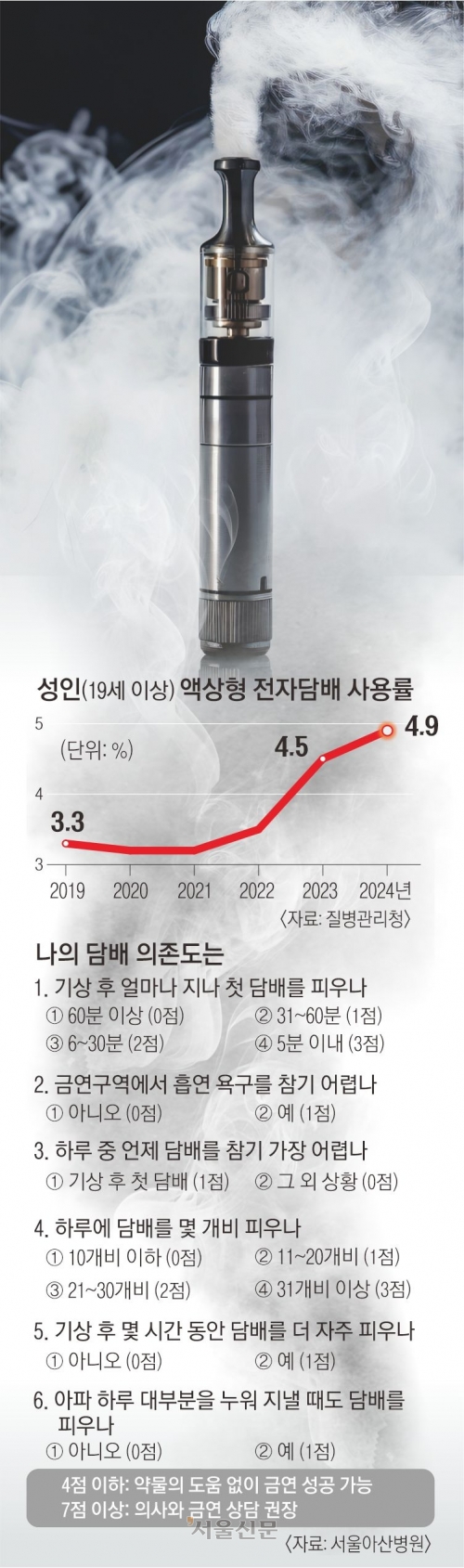 새해를 맞아 ‘완전 금연’을 선언했던 직장인 이모(45)씨는 한 달도 못 가 백기를 들었다. 그가 새로 손에 쥔 것은 매캐한 연기 대신 달콤한 향이 나는 액상형 전자담배였다. 연초보다 냄새가 덜하니 건강에도 덜 해롭지 않겠느냐는 자기 위안이었다.