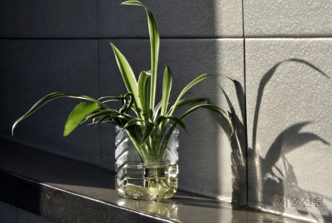서울의 한 빌딩 화장실을 청소하는 여사님이 쓰레기통에 버려질 수도 있는 플라스틱 페트병으로 화분을 만드셨습니다. 고단할 수도 있는 일터에서 보는 여성의 섬세한 손길이 잔잔한 미소를 띠게 합니다.
