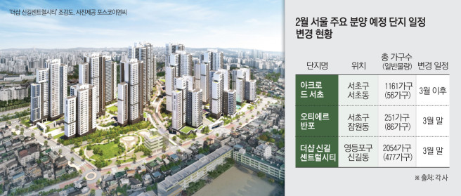 단지별로 보면 아크로 드 서초는 지난해 10월 입주자모집공고를 계획했다가 연기된 뒤 이달 말 공고 일정으로 다시 잡았지만 한 차례 더 연기하며 3월에 진행되는 방향으로 가닥을 잡았다. 반포권 오티에르 반포 역시 지난해 공급을 검토했다가 올해 2월로 한 차례 미뤘던 단지다.