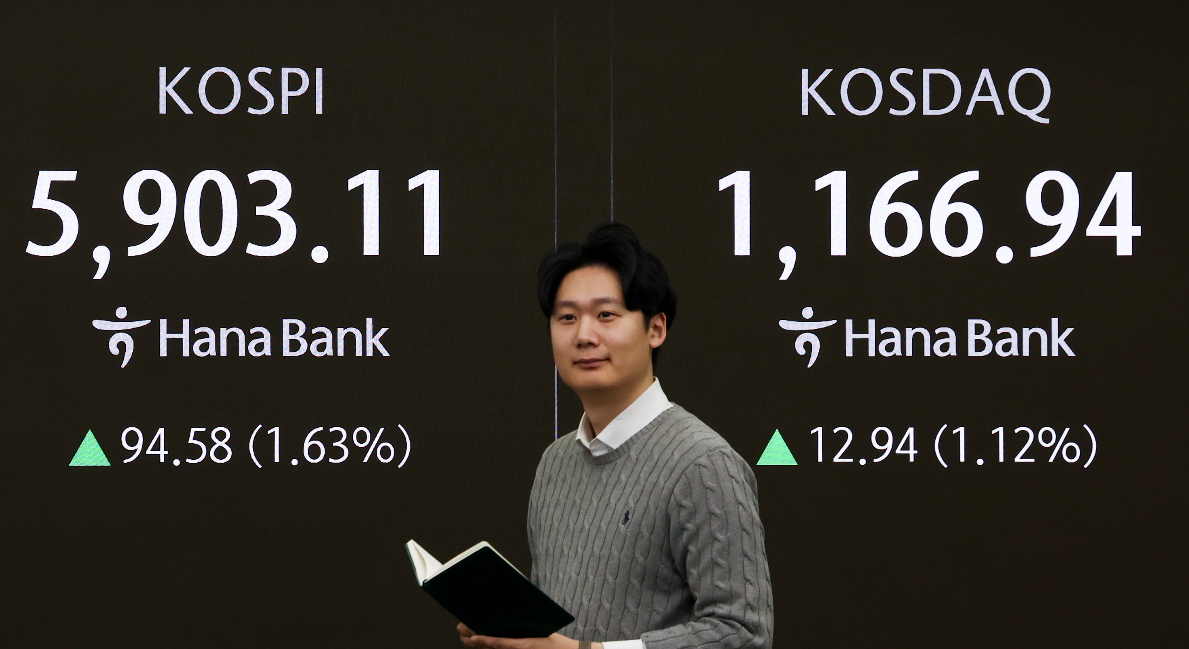 코스피가 상승 출발한 23일 서울 중구 하나은행 본점 딜링룸 전광판에 증시 시황이 표시되어 있다. /뉴스1 |