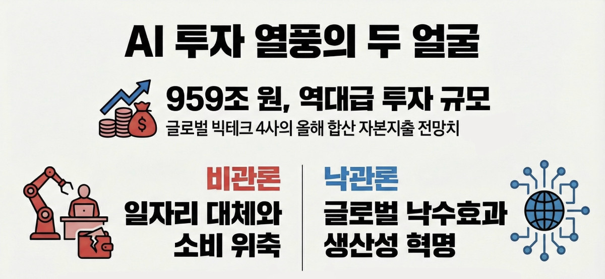전 세계 금융시장을 뜨겁게 달구고 있는 인공지능(AI) 투자 붐을 두고 낙관론과 비관론이 맞서고 있다. AI발 생산성 혁명이 글로벌 증시의 '낙수효과'로 이어질 것이라는 기대가 나오는 한편, AI발 고용위기와 소비 침체로 AI 투자 동력까지 줄어드는 '악순환'에 빠질 수 있다는 경고도 나온다.