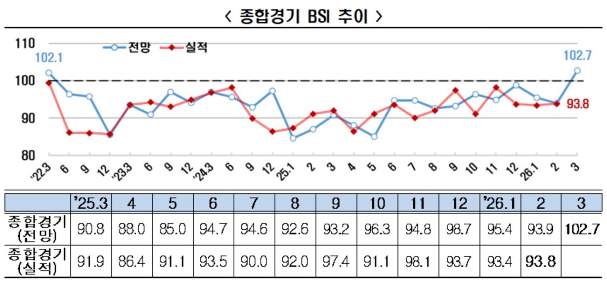 BSI가 100을 웃돌면 전월 대비 경기 개선을 뜻한다. 1월 95.4, 2월 93.9로 하락한 뒤 3월에 반등했다.