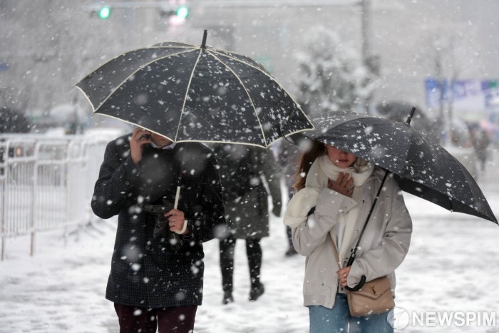 눈을 맞으며 시민들이 발걸음을 옮기고 있는 모습. [사진=뉴스핌 DB] |