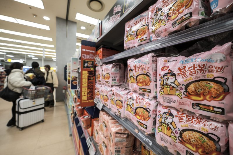 서울시내 대형마트를 찾은 여행객이 K푸드로 인기를 끌고있는 불닭볶음면을 살펴보고 있다. 뉴시스 |
