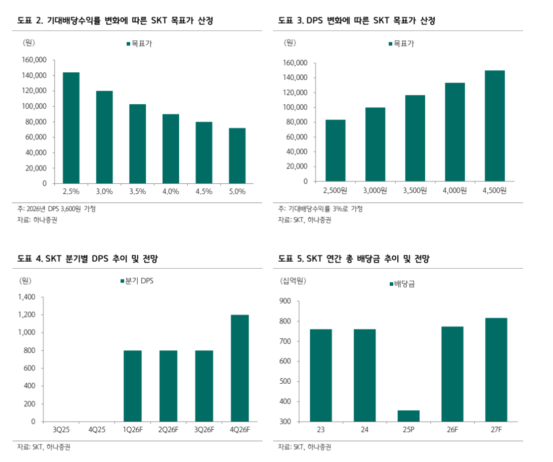 하나증권은 2026년 1분기 주당배당금(DPS)이 800원 이상으로 발표될 가능성이 높다고 봤다. 연간 DPS 역시 3600원 수준이 예상돼 조기 배당 정상화 기대가 커질 수 있다는 설명이다. 현재 주가 기준 기대배당수익률은 약 4.5%로, 비과세 배당을 감안하면 세후 기준 매력은 더 높다는 평가다.