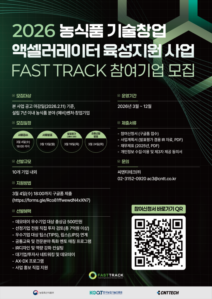 전화성 씨엔티테크 대표는 “패스트트랙은 단순 육성을 넘어 씨엔티테크의 핵심 농식품 투자 파이프라인”이라며 “그동안 연평균 5개사 이상에 10억 원 이상 규모의 직접 투자를 집행하고 TIPS 연계를 이어온 만큼, 이번에도 선발 기업이 실질적인 성과를 낼 수 있도록 끝까지 책임지고 지원하겠다”고 말했다.