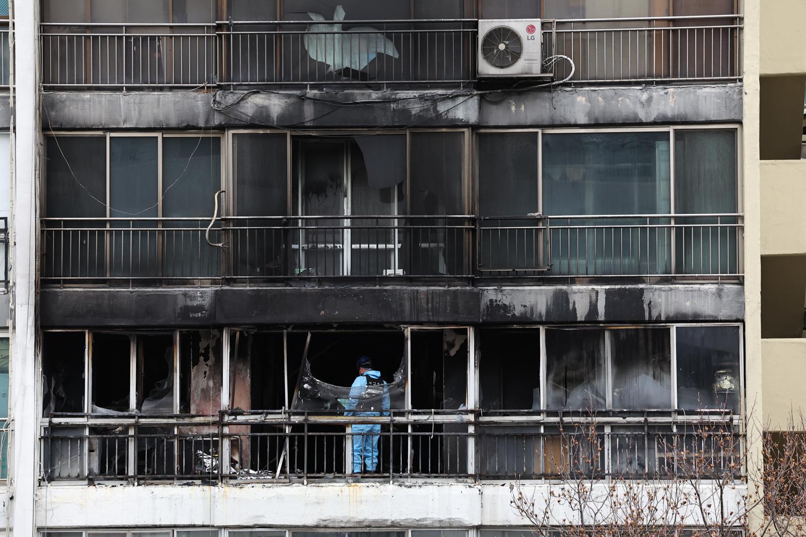24일 서울 대치동 은마아파트 화재현장에서 한국전기안전공사 사고조사 대원이 현장을 살펴보고 있다. 2026.02.24. 뉴시스 |