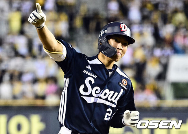 [OSEN=잠실, 조은정 기자]6일 오후 서울 잠실구장에서 ‘2025 신한 SOL Bank KBO리그’ LG 트윈스와 두산 베어스의 경기가 열렸다.LG는 최채흥, 두산은 콜어빈을 선발로 내세웠다.8회초 2사 1루 두산 김민석이 다시 앞서가는 투런 홈런을 날린 뒤 베이스를 돌고 있다. 2025.08.06 /cej@osen.co.kr |