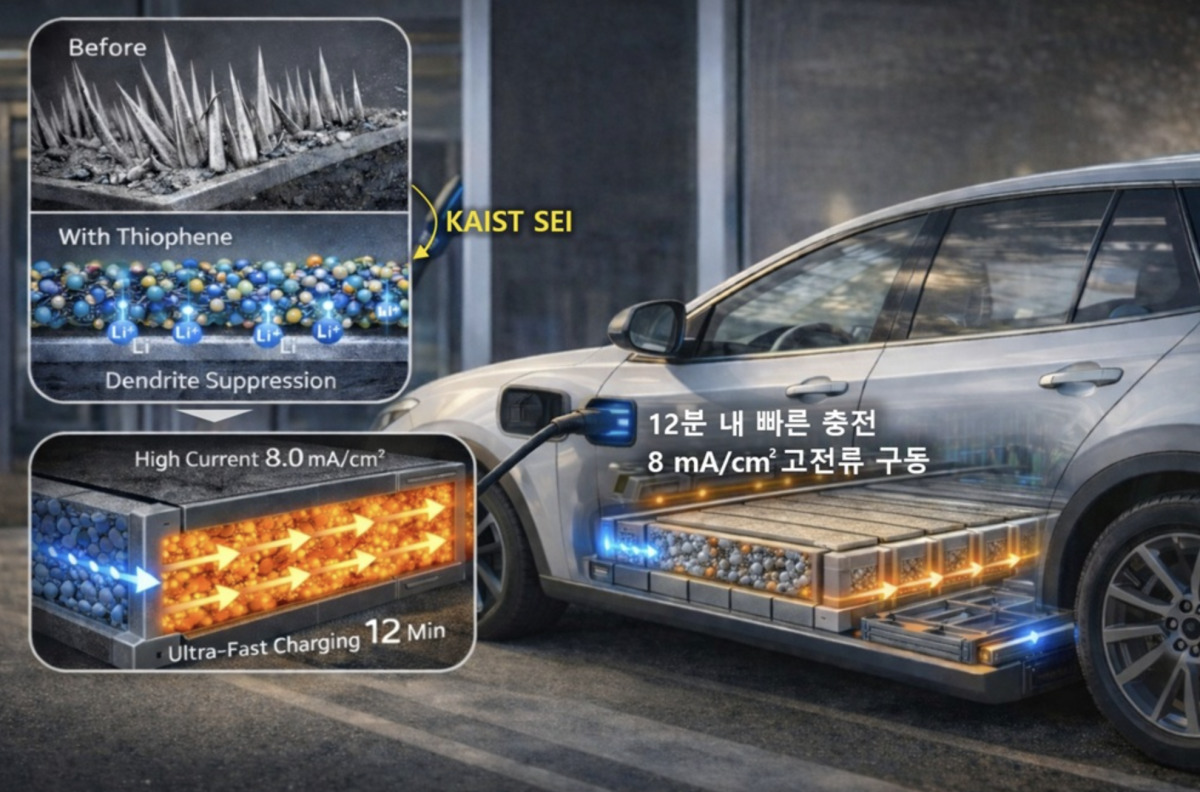 그 결과, 연구팀은 12분 내 빠른 충전과 8mA/cm⊃2; 이상의 고전류 구동을 동시에 구현하는 데 성공했다. 8mA/cm⊃2;는 배터리 전극 1cm⊃2; 면적당 8mA의 전류가 흐르는 수준으로, 통상 고전류로 평가되는 4mA/cm⊃2;보다 2배 이상 높은 조건이다. 이는 전기차의 고속 충전 및 급가속과 같은 실제 사용 환경에 근접한 수준이다.