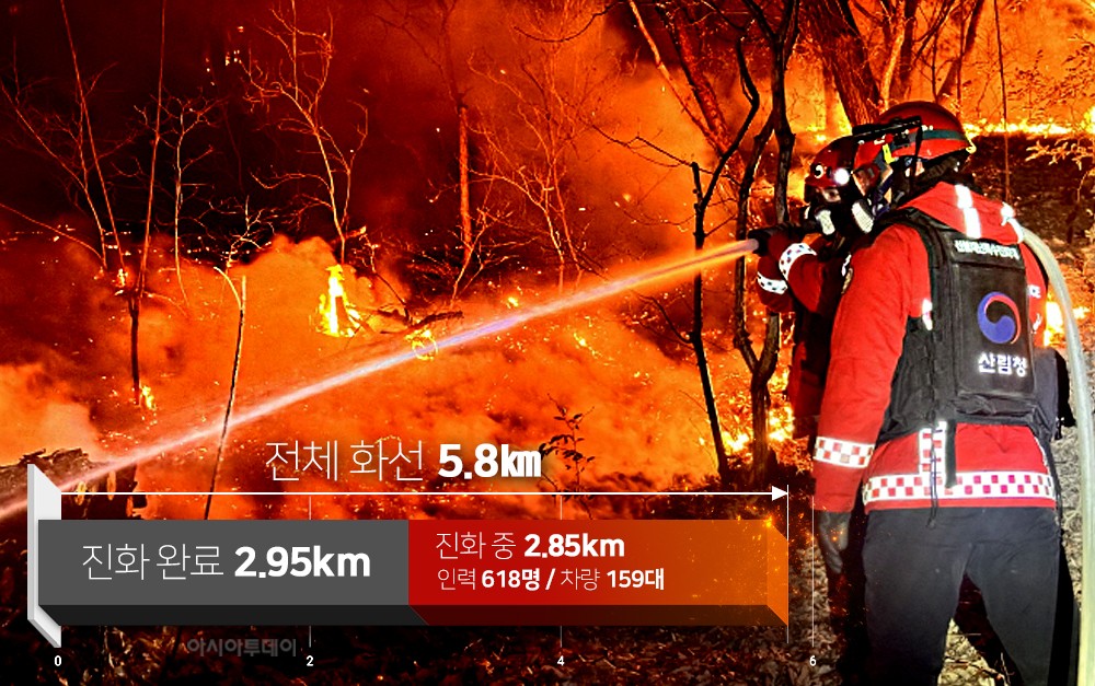 24일 산림당국에 따르면 이날 오전 5시 기준 밀양 산불 진화율은 51%다. 전체 화선 5.8㎞ 가운데 2.95㎞는 진화가 완료됐으며, 나머지 2.85㎞에 대해서는 진화 인력 618명과 차량 159대를 투입해 민가 주변 확산 저지에 주력하고 있다.