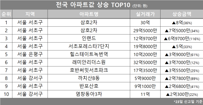 부동산 플랫폼 호갱노노에 따르면 23일 신고일 기준 전국 아파트 가운데 실거래가 상승 폭이 가장 컸던 단지는 서울 서초구 ‘삼호2차’로 나타났다. 이 단지는 30억원에 거래되며 직전 거래 대비 8억원(36%) 상승했다.