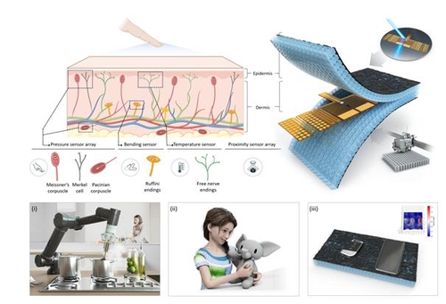 전자피부는 사람 피부처럼 압력이나 접촉을 감지하는 얇고 유연한 센서로, 지능형 로봇의 정밀한 촉각 구현에 활용될 핵심 기술이다.