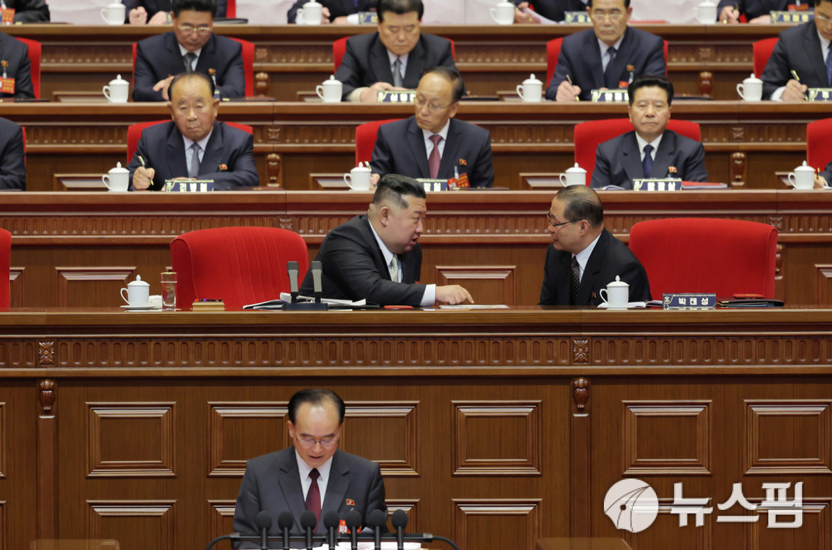 [서울=뉴스핌] 이영종 통일북한전문기자 = 23일 평양에서 열린 노동당 제9차 대회 5일째 회의에서 당 총비서 겸 국무위원장인 김정은(왼쪽)이 박태성 총리와 이야기를 나누고 있다. 아래 연설하는 인물은 조용원 노동당 조직담당 비서. [사진=북한매체 종합] 2026.02.24 yjlee@newspim.com |