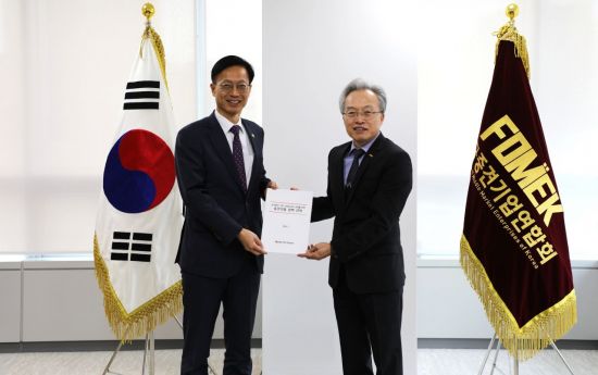 최진식 한국중견기업연합회 회장(오른쪽)이 김용선 지식재산처장에게 '지식재산 기반 성장사다리 강화를 위한 중견기업 정책 건의'를 전달하고 있다. 중견련 |