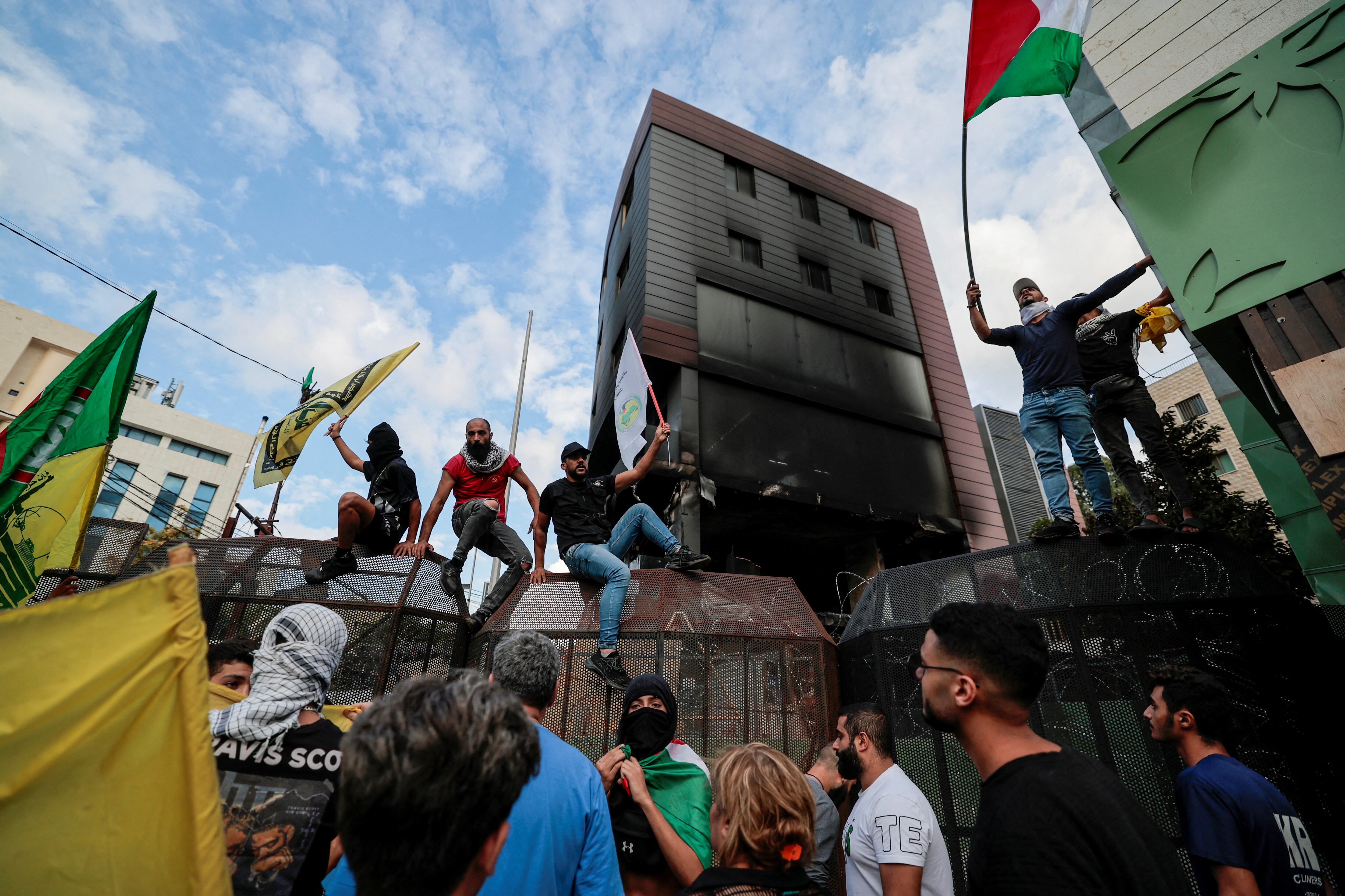 지난 2023년 10월18일(현지 시각) 레바논 베이루트 교외 아우카르에 위치한 미국 대사관 근처에서 팔레스타인인들을 지지하는 시위가 벌어지고 있다. / 로이터=연합 |