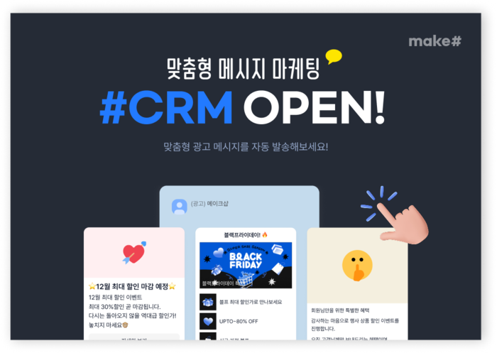 #CRM은 고객별 맞춤형 광고 메시지를 자동으로 발송하는 서비스다. 고객 행동과 구매 이력 등 쇼핑몰 데이터를 기반으로 수신자를 세분화해 고객 반응도와 전환율을 높일 수 있다. 메이크샵이 다년간 수십만 상점의 운영 데이터를 기반으로 대용량 검색엔진 시스템을 구축해 자체 개발했다.