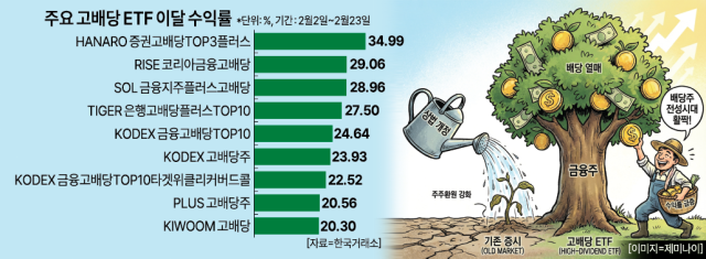 23일 한국거래소에 따르면 이달 들어 'HANARO 증권고배당TOP3플러스'는 34.99%의 수익률을 기록하며 전체 ETF 수익률 1위를 기록했다. 뒤이어 'RISE 코리아금융고배당'(29.06%), 'SOL 금융지주플러스고배당'(28.96%)이 수익률 10위권에 올랐다. 'TIGER 은행고배당플러스TOP10'(27.50%), 'KODEX 금융고배당TOP10'(24.64%), 'KODEX 고배당주'(23.93%), 'KODEX 금융고배당TOP10타겟위클리커버드콜'(22.52%), 'PLUS 고배당주(20.56)', 'KIWOOM 고배당(20.30%)' 등 고배당 ETF가 견조한 수익률을 보였다.