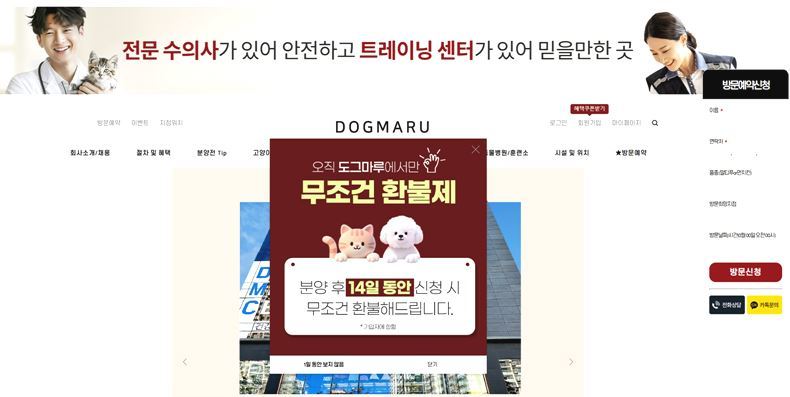 하지만 계약서 내용과는 달리 실제 도그마루 홈페이지에는 ‘무조건 환불제’ “분양 후 14일 동안 요청 시 무조건 환불해 드립니다”라는 문구가 담긴 팝업이 게시돼있다. 다만 하단에는 ‘가입자에 한함’이라고 작은 글씨로 표기돼있었다.