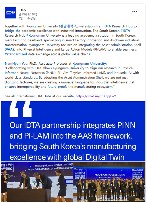유남현 IDTA Research Hub Korea 총괄 책임자는 "경남대가 축적해 온 제조 AI 역량이 글로벌 표준 연구 단계로 도약했음을 의미한다"며 "피지컬 AI와 제조 데이터 표준 연구를 통해 지역 제조 기업의 국제 경쟁력 강화에 기여하겠다"고 말했다.