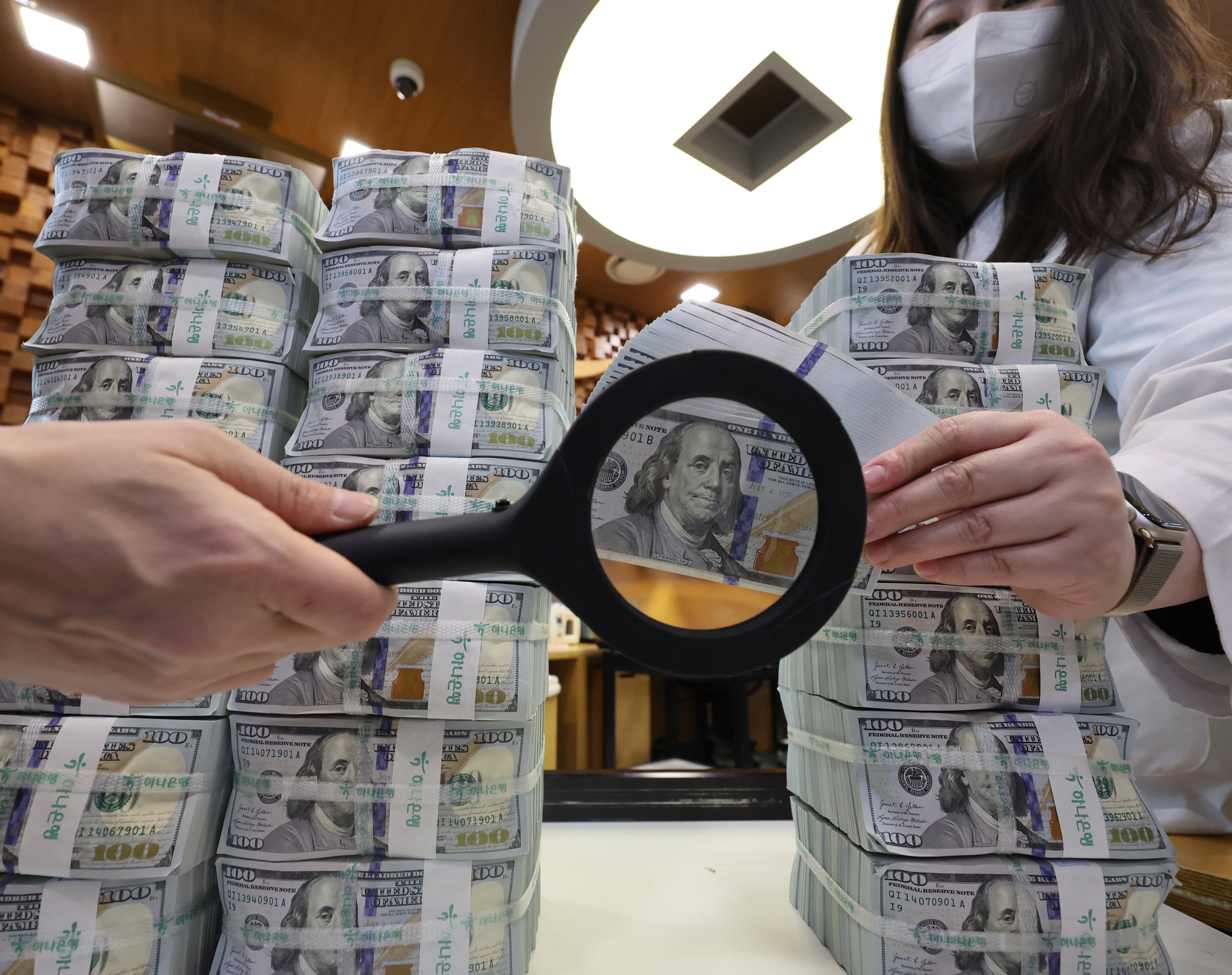 서울 중구 하나은행 위변조대응센터에서 직원이 달러화를 정리하고 있다./연합뉴스 |