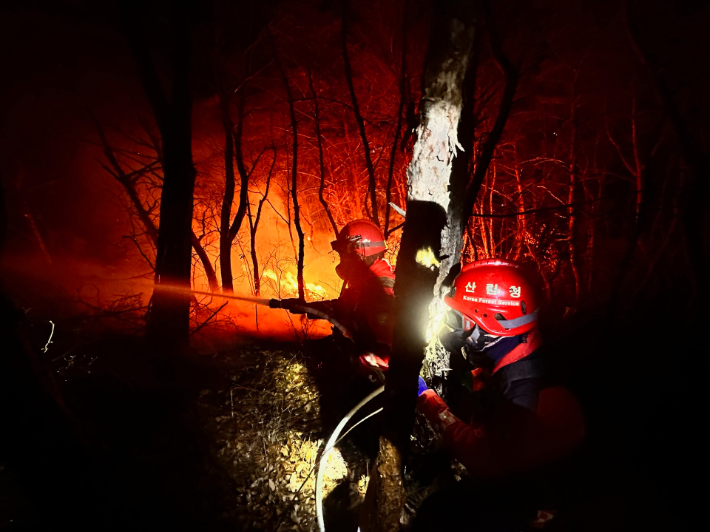 산불영향구역은 134ha, 불의 길이는 6km, 잔여 화선은 1.8km다. 다행히 이날 낮부터 약하지만, 비 소식이 예보돼 주불 진화 기대감이 커지고 있다.