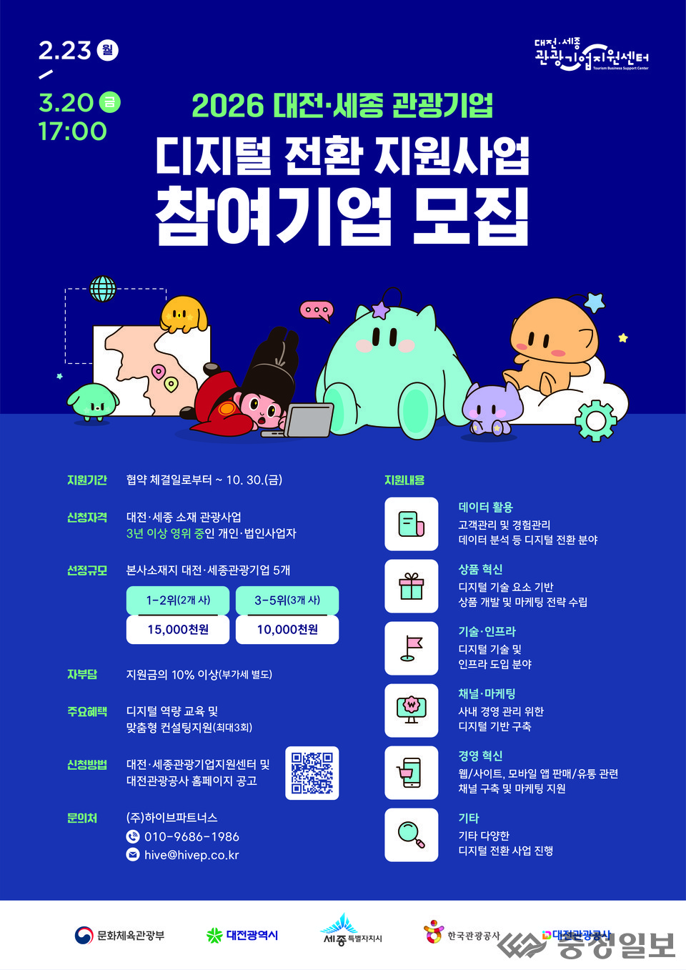 지역 관광기업의 체질 개선을 위한 디지털 혁신 프로그램이 가동된다. 대전관광공사가 '2026 대전·세종 관광기업 디지털 전환 지원사업' 참여기업을 2월 24일~3월 20일까지 모집한다.