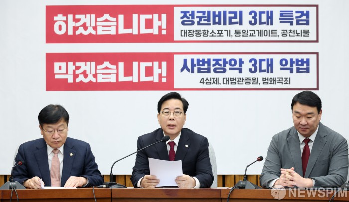 [서울=뉴스핌] 정일구 기자 = 송언석 국민의힘 원내대표가 24일 오전 서울 여의도 국회에서 열린 원내대책회의에서 모두발언을 하고 있다. 2026.02.24 mironj19@newspim.com