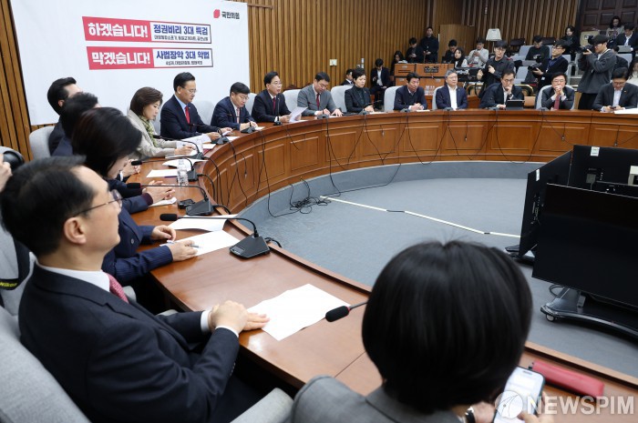 [서울=뉴스핌] 정일구 기자 = 송언석 국민의힘 원내대표가 24일 오전 서울 여의도 국회에서 열린 원내대책회의에서 모두발언을 하고 있다. 2026.02.24 mironj19@newspim.com