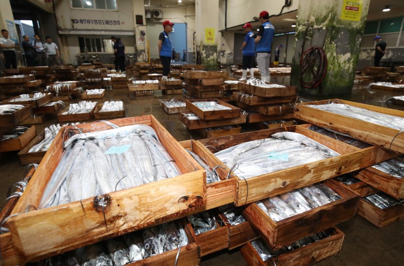 제주시수협 위판장에서 수협 관계자들과 어민들이 경매를 준비하고 있다. 제주특별자치도는 전자상거래와 홈쇼핑 채널을 통한 유통 다변화에 나선다. /사진=뉴스1 |