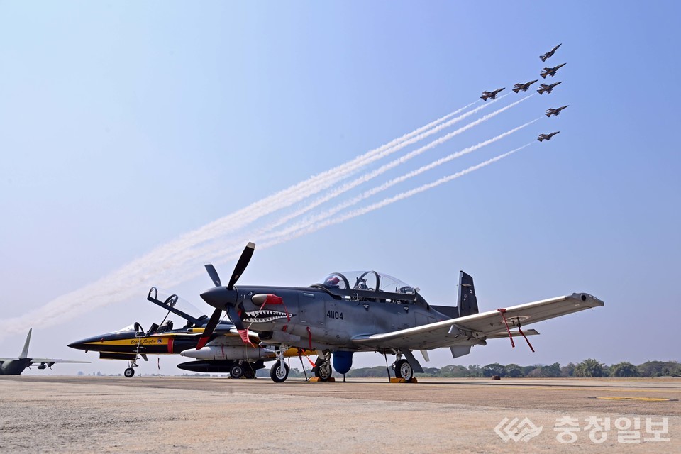 사우디 WDS 2026 참가를 마치고 한국으로 복귀 중인 블랙이글스가 지난 18일 태국 치앙마이 공군기지에서 한·태 공군 우정비행을 실시하고 있다. 지상에 주기된 항공기는 블랙이글스의 T-50B(왼쪽)와 태국 공군의 AT-6TH |