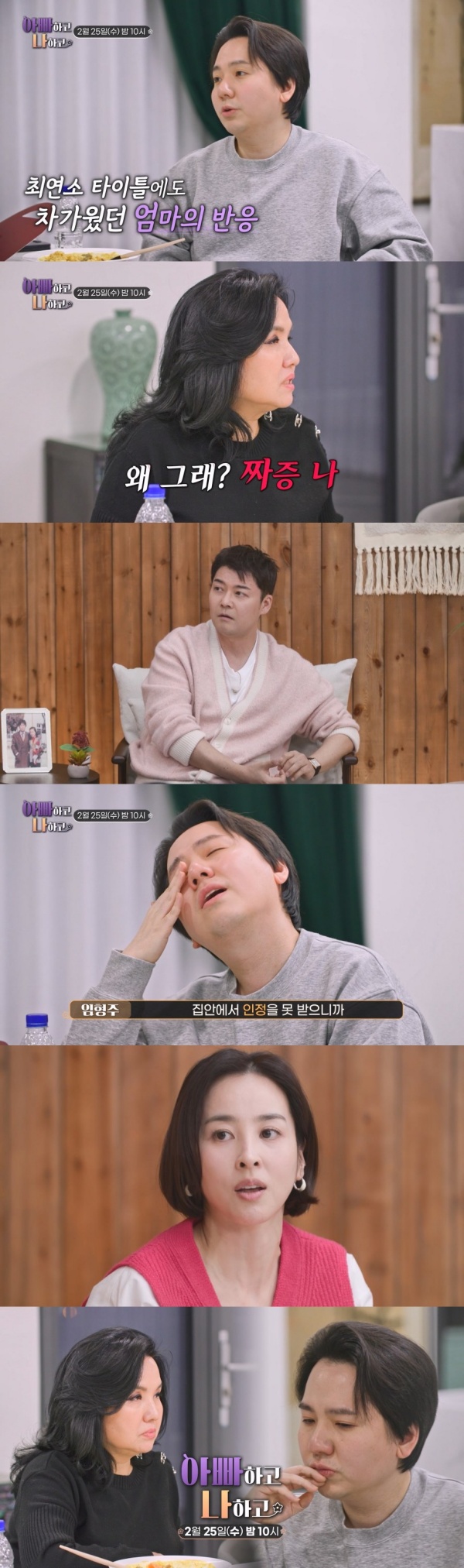 오는 25일 방송되는 TV CHOSUN 예능 '아빠하고 나하고 시즌3'(이하 '아빠하고')에서는 임형주 모자가 임형주의 데뷔부터 함께한 오랜 지인이자 기자 출신 작가 유인경과 만난다. 용산문화재단 역대 최연소 이사장으로 공직에 나서게 된 임형주는 유인경에게 임명장 받은 소식을 전했고, 임형주의 엄마 헬렌 킴은 "그만해"라며 아들의 자랑을 단속했다. 이에 유인경은 "임형주가 왜 자랑하겠냐. 엄마한테 자랑했더니 거절당해서 다른 사람한테 확인받고 싶은 거다"라며 임형주의 편을 들어줬다. 이에 임형주는 "속 시원하다. 엄마가 조금이라도 인정해 주면 진짜 남한테 할 게 없는데 안 해주니까…"라며 무심한 엄마에게 서운함을 드러냈다.