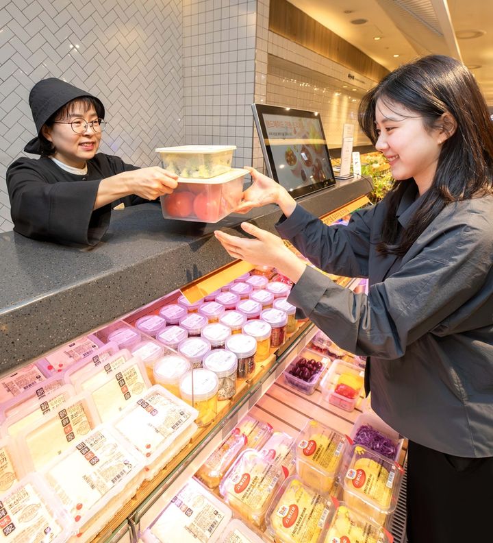 [서울=뉴시스] 현대백화점 프레시테이블에서 다회용기 지참하기를 실천 중인 고객의 모습. (사진=현대백화점그룹 제공) *재판매 및 DB 금지 |