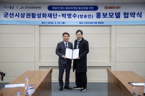 군산시상권활성화재단은 지난 23일 시청 상황실에서 개그맨 박명수와 공공배달앱 ‘배달의 명수’ 홍보모델 업무협약을 체결했다고 24일 밝혔다.
