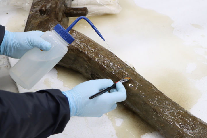 문화유산보존과학센터가 유물 외형과 구조를 안정적으로 보존하기 위해 수용성 수지인 폴리에틸렌글라이콜(PEG)을 침투시켜 목재 조직을 강화했고, 진공동결건조법을 적용해 형태 변형을 최소화하는 보존 처리를 했다.
