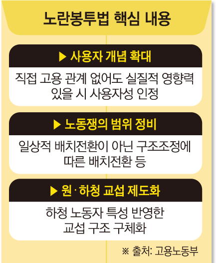 정부가 다음 달 개정 ‘노동조합 및 노동관계 조정법(노조법)’ 시행을 앞두고 ‘사용자 범위’와 ‘노동쟁의 대상’에 대한 해석을 확정했다. 더불어 복잡한 원·하청 교섭 쟁점을 지원하기 위한 전담 위원회를 신설해 25일부터 유권해석 신청을 받는다.