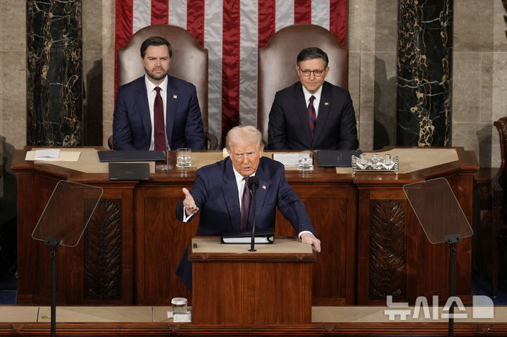 [워싱턴=AP/뉴시스]도널드 트럼프 미국 대통령이 지난해 3월4일(현지 시간) 미국 워싱턴DC 국회의사당에서 의회 상하원 합동 연설을 하고 있다. 트럼프가 올해 국정 연설을 하는 24일을 하루 앞두고 그가 미국을 잘못 이끈다는 여론조사 결과가 발표됐다. 2026.2.24. |