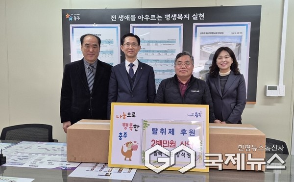 (충주=국제뉴스) 김상민 기자 = 충북 충주시 노은면 소재 팜텍(대표 강석상)이 24일 충북 충주시청을 방문해 지역 내 독거어르신들의 생활환경 개선을 위해 자체 개발한 탈취제 200만 원 상당을 기탁했다.