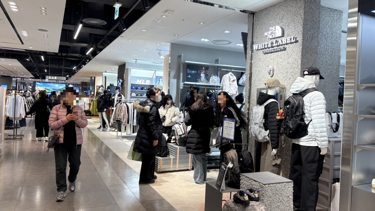 발길이 몰린 곳은 아웃도어 패션 브랜드가 모인 5층이었다. 에스컬레이터를 오르자 노스페이스 화이트라벨 제품이 전면에 진열된 간이 매대가 눈에 들어왔다. 중국인 관광객들은 연신 점퍼와 플리스를 입어보며 거울 앞을 오갔다. 계산대 앞에는 순서를 기다리는 줄이 길게 늘어섰다. 직원들은 중국어로 제품 설명과 재고를 안내했다.