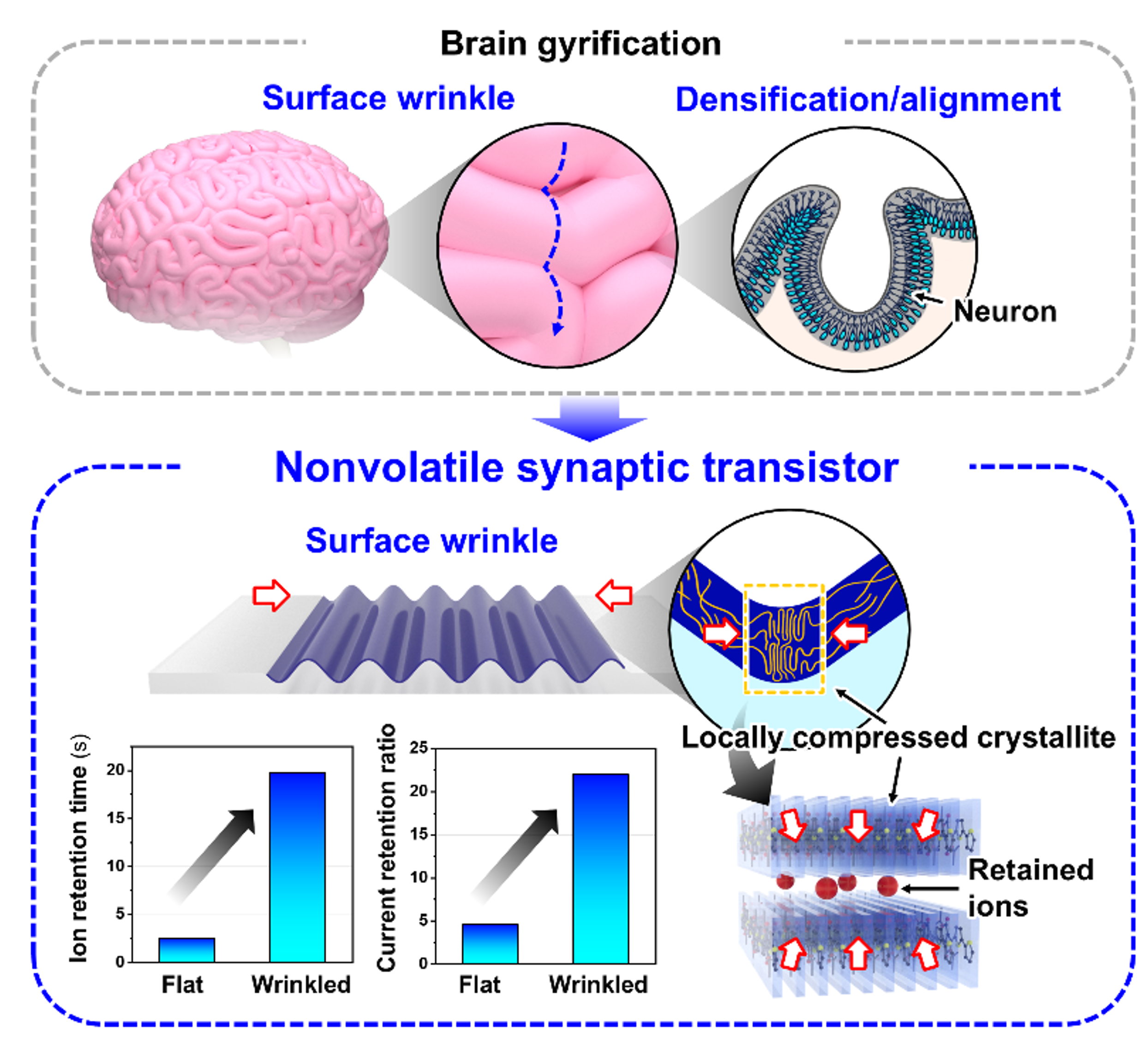 연구팀은 인간의 대뇌 피질이 부피 확장 대신 주름을 형성해 신경 세포 간 접점을 극대화한 현상에 주목했고 뇌의 주름 진화를 전자소자에 응용했다. 고분자 반도체 박막에 기계적 압축을 가해 미세한 주름 구조를 형성해 박막 내 결정 구조를 제어했다.