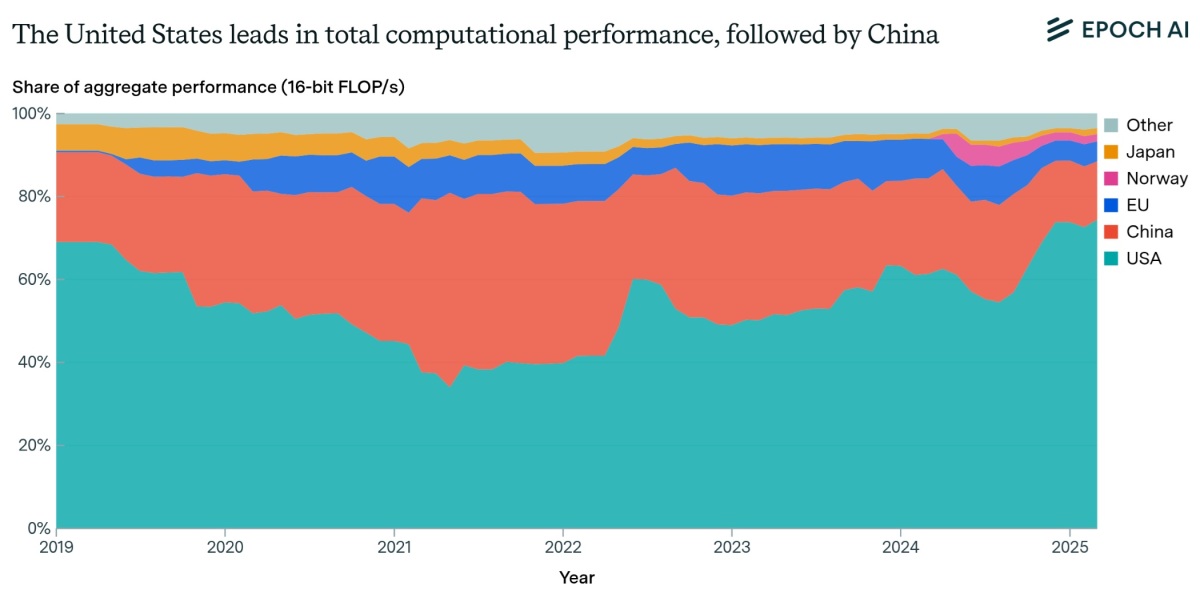 AI 트렌드와 거버넌스를 분석하는 연구기관 에폭 AI(Epoch AI)의 분석에 따르면 2025년 5월 기준 전 세계 AI 클러스터 성능의 약 4분의 3이 미국에, 15% 가량이 중국에 집중돼 있다. 유럽연합(EU) 전체와 일본, 노르웨이 등 전통적 HPC(고성능 컴퓨팅) 강국이 나머지를 나눠 갖는 구조다.