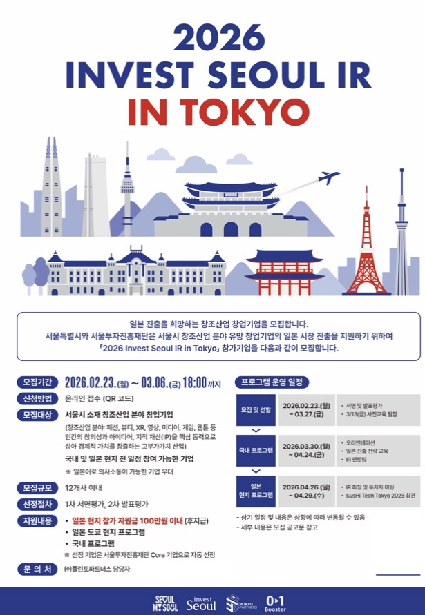 [서울경제TV=박수열기자] 서울시 해외 투자유치 전담 기구인 서울투자진흥재단은 서울 소재 유망 기업의 일본 시장 진출과 투자 유치를 지원하는 ‘2026 인베스트서울 도쿄 IR(Invest Seoul IR in Tokyo)’ 프로그램 참가 기업을 모집한다고 24일 밝혔다.