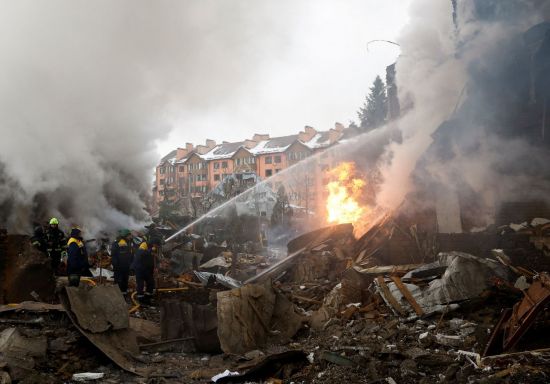22일(현지시간) 우크라이나 수도 키이우에서 소방대원들이 러시아군의 무인기(드론) 공습으로 발생한 화재를 진화하고 있다. 로이터연합뉴스 |