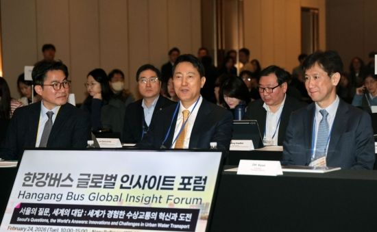 오세훈 서울시장이 24일 서울 마포구 호텔나루에서 열린 '한강버스 글로벌 인사이트 포럼'에 참석하고 있다. 이날 포럼은 영국 런던, 미국 뉴욕, 호주 브리즈번 등 글로벌 수상교통 전문가들이 참석해 각 도시의 대표 사례를 소개하고 한강버스 발전 방안을 모색하기 위해 열렸다.