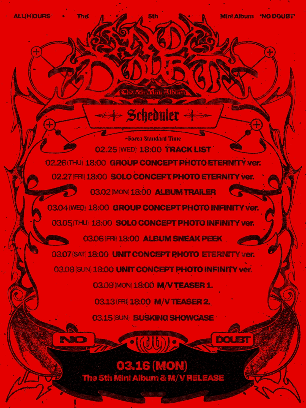 24일 소속사 이든엔터테인먼트는 "올아워즈(건호, 유민, 제이든, 민제, 마사미, 현빈, 온)가 오는 3월 16일 다섯 번째 미니앨범 'NO DOUBT(노 다웃)'을 발매한다"라고 밝혔다.