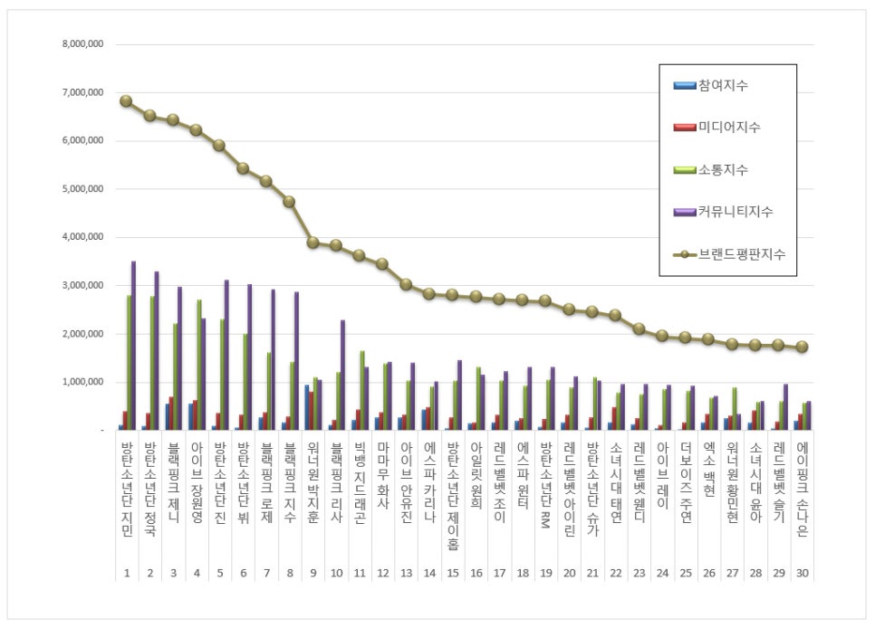 아이돌 개인 브랜드평판 1위를 기록한 방탄소년단 지민 브랜드는 참여지수 111,921 미디어지수 393,479 소통지수 2,803,088 커뮤니티지수 3,495,848이 되면서 브랜드평판지수 6,804,336으로 분석됐다. 지난 1월 브랜드평판지수 8,780,962와 비교해보면 22.51% 하락했다.