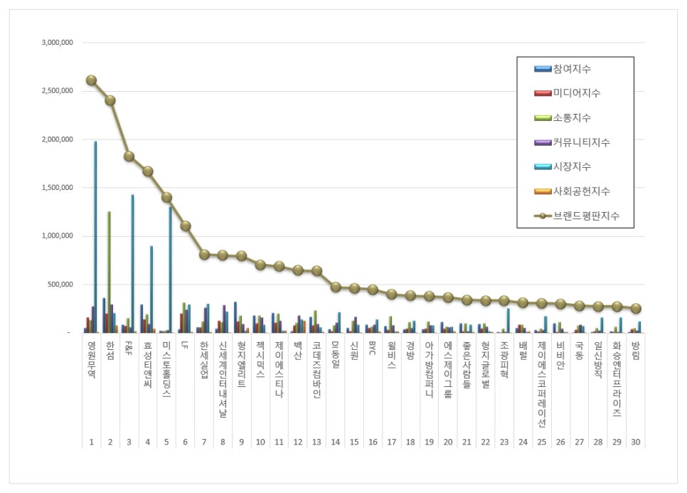 3위, F&F 브랜드는 참여지수 84,232 미디어지수 74,511 소통지수 156,955 커뮤니티지수 61,680 시장지수 1,428,484 사회공헌지수 20,217이 되면서 브랜드평판지수 1,826,079로 분석됐다. 지난 1월 브랜드평판지수 1,871,223과 비교해보면 2.41% 하락했다.