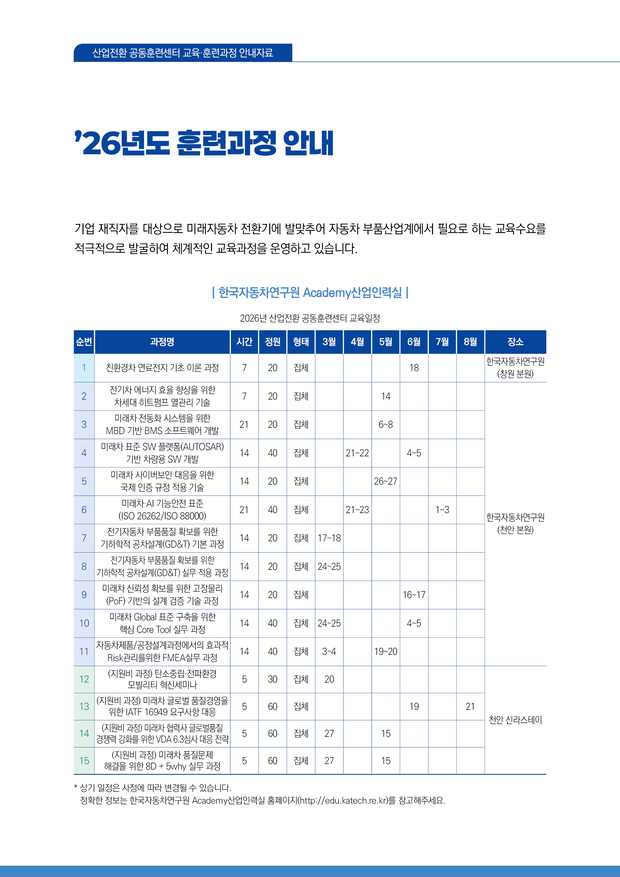 산업전환 공동훈련센터 사업은 산업구조 변화에 대응할 수 있도록 기업과 근로자의 역량을 강화하고 친환경·자율주행 등 미래차 분야로의 원활한 전환을 지원하는 국가 사업이다. 한자연은 2025년부터 2029년까지 5년간 사업을 수행한다. 운영 첫 해인 지난해 한자연은 161개 기업과 협약을 체결하고 연료전지·전동화·자율주행 등 미래차 핵심 분야를 중심으로 교육 과정을 운영했다.