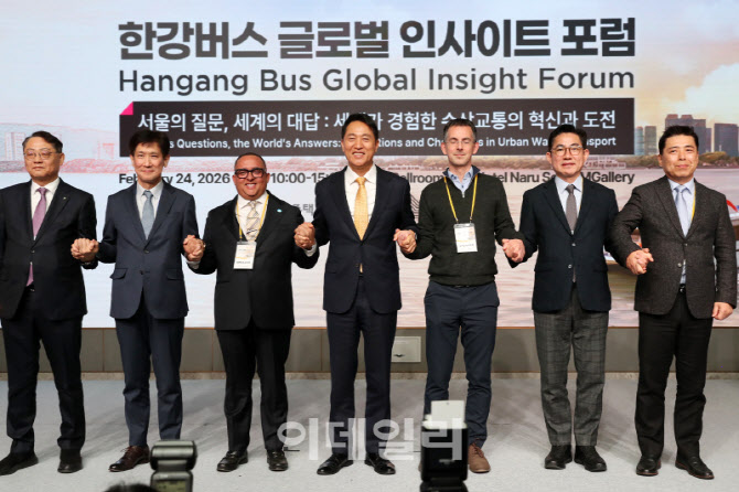 [이데일리 김태형 기자] 오세훈(가운데) 서울시장이 24일 서울 마포구 호텔나루 서울엠갤러리에서 열린 ‘한강버스 글로벌 인사이트 포럼’에서 참석자들과 기념촬영을 하고 있다.