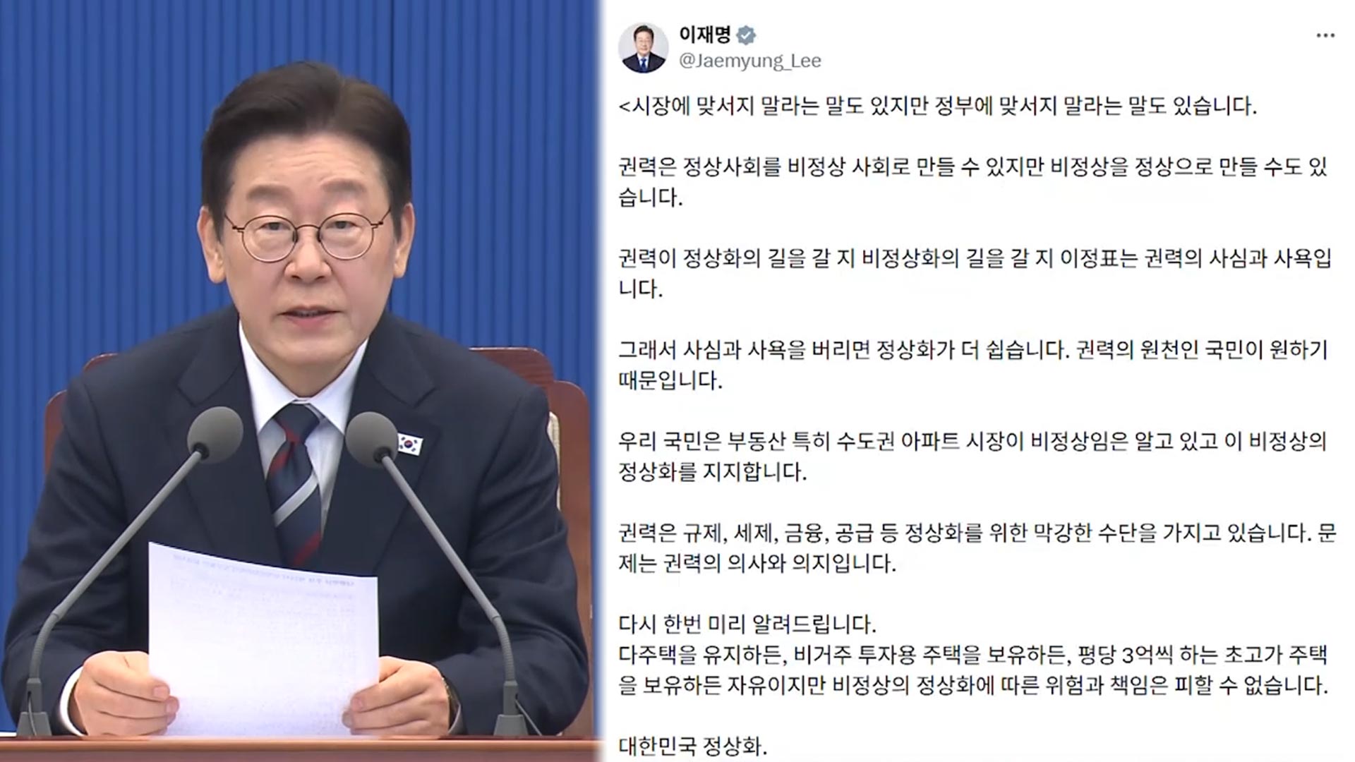 네, 이재명 대통령은 오늘(24일) 오전 "권력은 비정상을 정상으로 만들 수 있다"며 부동산 시장 정상화 의지를 거듭 강조하는 SNS 글을 올렸습니다.