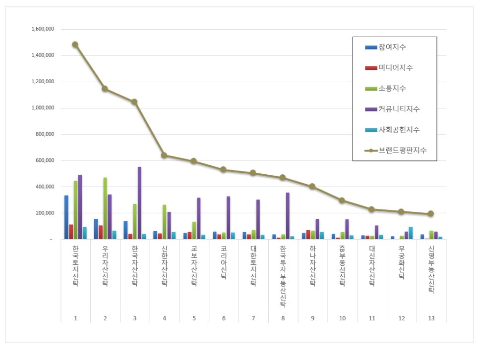 국내 부동산신탁 브랜드평판 2026년 2월 13위까지의 분석 순위는 한국토지신탁, 우리자산신탁, 한국자산신탁, 신한자산신탁, 교보자산신탁, 코리아신탁, 대한토지신탁, 한국투자부동산신탁, 하나자산신탁, KB부동산신탁, 대신자산신탁, 무궁화신탁, 신영부동산신탁 순으로 분석됐다.